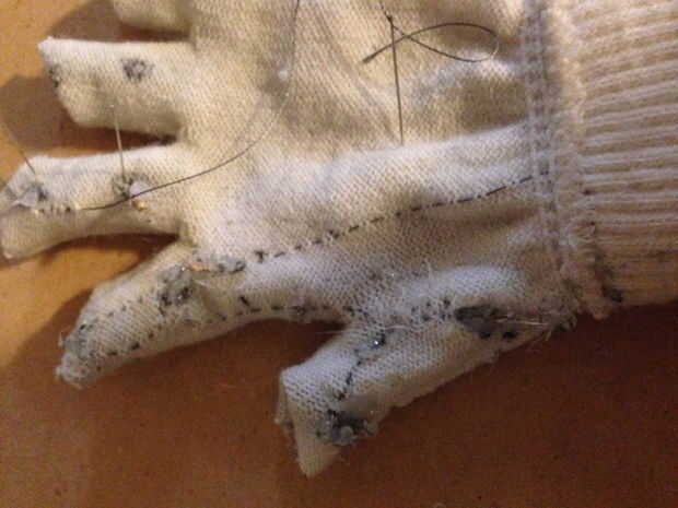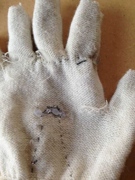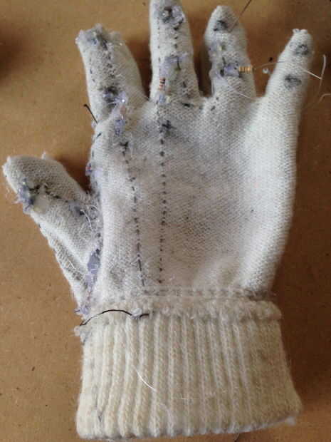 Asoman los extremos del LED con el guante (o hacer un corte). Atar el hilo conductor a las patas del LED y la capa de pegamento caliente para fijar componentes y para cubrir los extremos afilados.