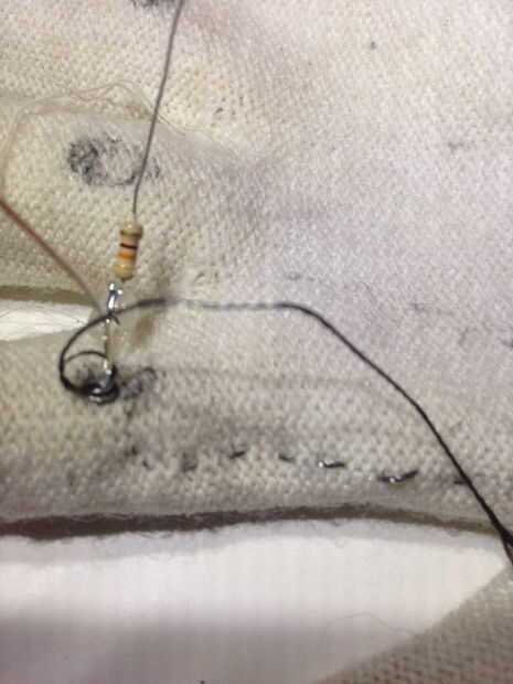 Coser el hilo conductor de la pata de la resistencia a la pata de la fotorresistencia, luego atar firmemente hilo a photoresistor pierna. Conexiones de la capa de pegamento caliente.