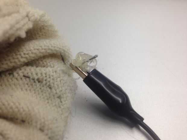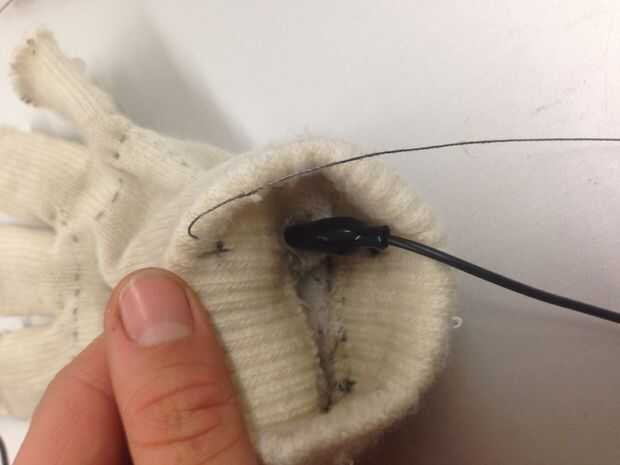 Mi diseño inicial había utilizado hilo conductor para ambos cables de batería, pero esto pone en cortocircuito el guante tantas veces que reemplacé con una pinza en el diseño final. Esto funciona mucho mejor, es más seguro y se recomienda seriamente sobre el hilo conductor. Si no tienes un clip de piel de cocodrilo, funciona cualquier cable aislado.
