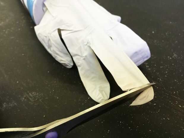 Preparándose para una bola de año nuevo... negro, brillante vestido este año...Accidentalmente, me cruzo con algunos calcetines brillantes viejos, un poco rotos en mi armario, y surge una idea! GUANTES!Paso 1: Cortar la parte superior de su viejo par
