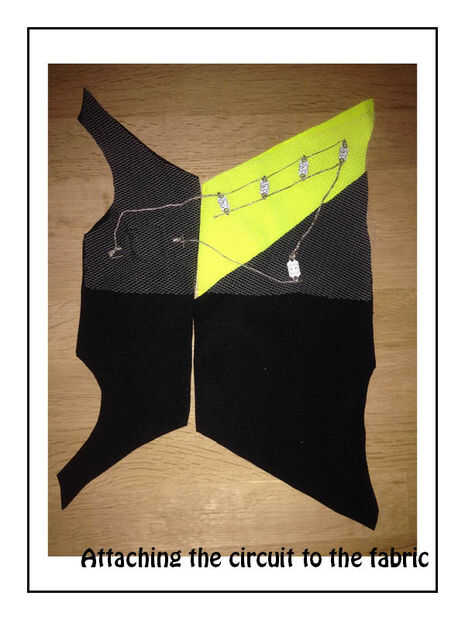 Prender las piezas del top de Lycra y tejido de alta visibilidad juntos y coser con la máquina de coser. Lo mismo para las piezas de la espalda. Utilizando una pequeña cantidad de bondaweb, instale la pieza superior de la tela para la pieza superior de la red, utilizando la plancha y un papel parafinado o una toalla de té y repita para el panel posterior. Tenga cuidado de no conectar el circuito o hilo de rosca a la bondaweb. Conecte los hilos sueltos de su circuito en el soporte de la batería, asegurándose de que va a conectar el lado positivo de la batería y el interruptor, el lado negativo para el último LED.