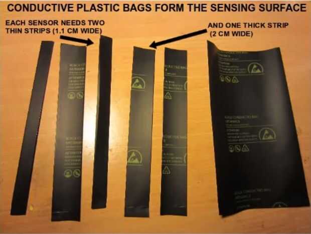 Usted necesitará dos finas tiras (cada 1,1 cm ancho) y una franja de ancho (2cm de ancho) para cada sensor. Las dos tiras delgadas actúan como la capa externa del pan en un sandwich así que si utilizas el lado de la bolsa de plástico, usted conseguirá un agradable final presealed en un lado.