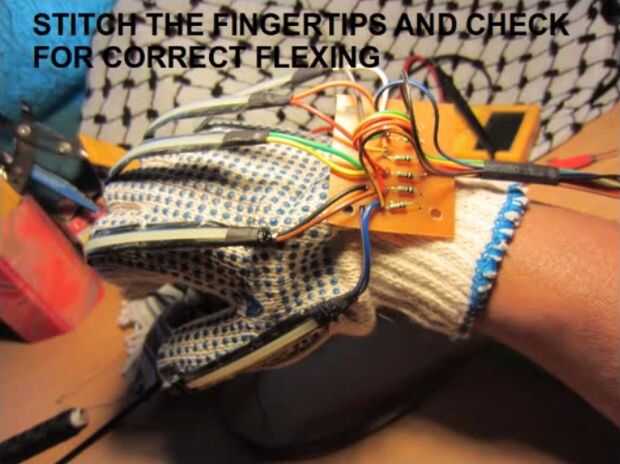 Ahora que todos los sensores y el circuito está listo, coloque los sensores en el guante y coser la punta del dedo de cada sensor en su lugar.