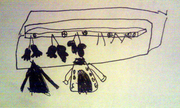 Mi hijo de 11 años preguntó por qué no combinar la rejilla de la manopla con un perchero.  Le dije a amigo diseñador que sé vio y sugirió también que cuelgo las pinzas directamente de capa clavijas para que servirían las dos funciones.  Que * le * hace cosas más ordenado, pero una vez una capa pierdes la habilidad de ver que mitones son presentes o ausentes.  Se trata de una estrategia visual similar con