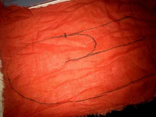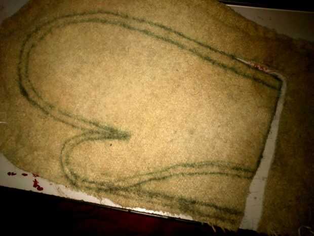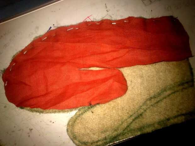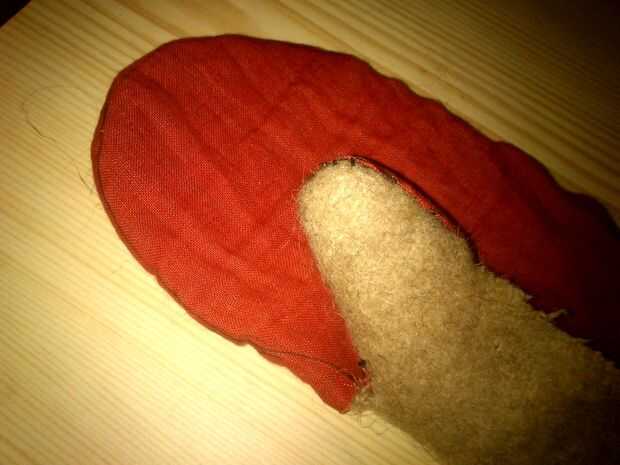 Ahora finalmente ha tiempo para coser todo junto. Primero instale los anillos en la parte de lana. Después de coser parte de lino y lana. Este podría ser un poco complicado. Usted necesita doblar la parte del pulgar de la pieza de lino "envuelta" con la parte de lana y coserlo. Esto hará que el producto final se verá como más como un guante a un tomaollas.