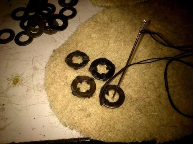 Nota: Tenía pocos arandelas, así que cosí solamente en las partes, que no estaban protegidas por brazales. También reemplacé algunas arandelas con piezas de cuero.