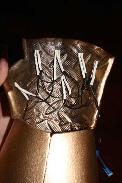 Después de dimensionar las piezas de espuma en el guante y la pintura de las piezas, puede instalar los LEDs. Luego, utilice pegamento caliente para unir todas las piezas del guante de cuero. Es mejor que trabajar desde las puntas de los dedos hasta el brazalete, de esta manera que usted puede asegurarse de que las piezas superpuestas encajan bien y moverse adecuadamente.