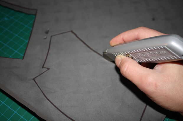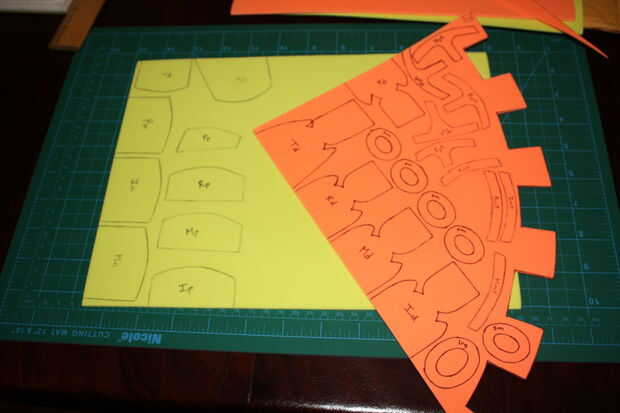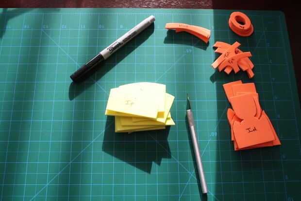 Una vez que estaba satisfecho con el tamaño y la colocación de las plantillas los quité todo del guante y trazada sobre el rodillo de espuma de EVA (para la mano y el puño) u hojas de espuma de oficio (para el adorno y los dedos) con un rotulador. Recorte las formas con un cuchillo de la maquinilla de afeitar y hobby, pero se pueden utilizar un cuchillo térmico o tijeras. Asegúrese de rotular su frente de pedazos y así puede juntarlos y colocarlos en el guante después de usted pintarlos.
