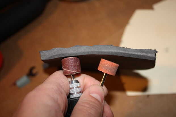 He encontrado varias maneras de formar la espuma, cada uno de ellos con sus propios méritos. Personalmente me gusta usando una herramienta giratoria lo mejor, abre las células de la espuma para fácil adherir con pegamento y ofrece las más bellas formas. Puede quitar secciones más grandes de espuma con un poco áspero y más pequeño, más detallado y suave las secciones con un suave poco (ver imagen). Este método es bastante desordenado, así que usar una máscara. También se puede utilizar un cuchillo térmico o un soldador que es limpiador pero produce algunas emanaciones desagradables y los errores son mucho más difíciles de corregir. Por último puede usar su navaja, pero este método es lento, desordenado y puede necesitar lijado adicional.