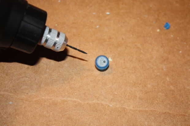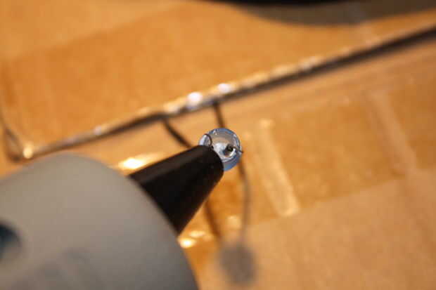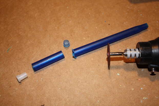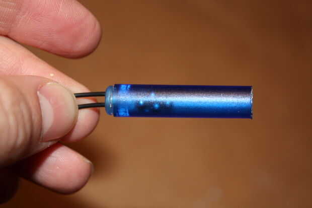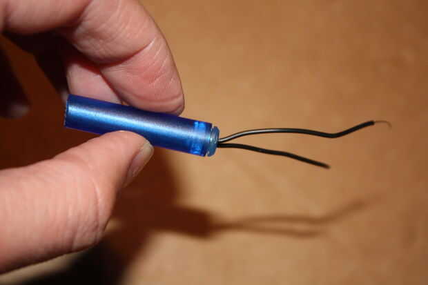 Para hacer el interruptor, corte un tercio de un bolígrafo y perfore dos agujeros en la tapa apenas lo suficientemente grande como para que el cable. Tira de ambos extremos de dos cables y uno de los extremos de cada uno en cada orificio de alimentación. Los cables eran bastante apretados, pero se puede anudar el juntos una vez que pasan a través de si eres nervioso que te tire hacia atrás y/o caliente pegamento en la tapa para que no se toquen.