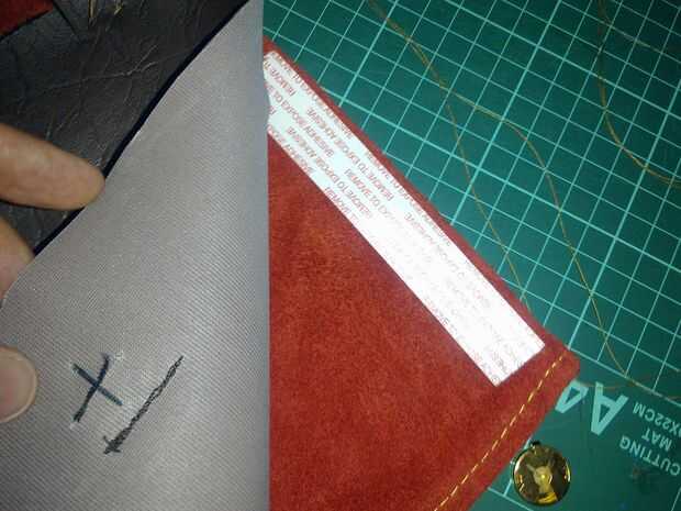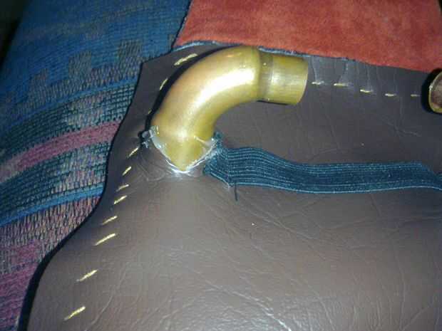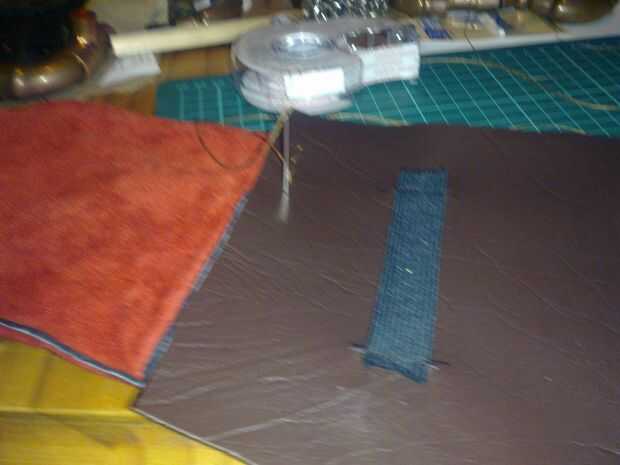 Foto 3: Una vez que se han cosido los tres lados, deslice la lámina de plástico entre el cuero y el guante e Inserte el tubo a través de los agujeros. Pegue el tubo de plástico y cuero. (Disculpas, no consigue ningún excelentes fotos de esta parte)