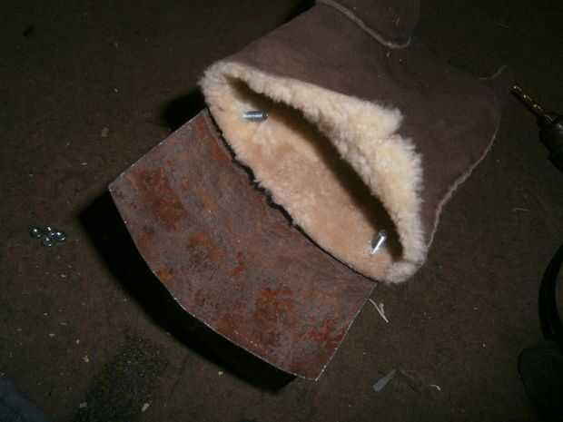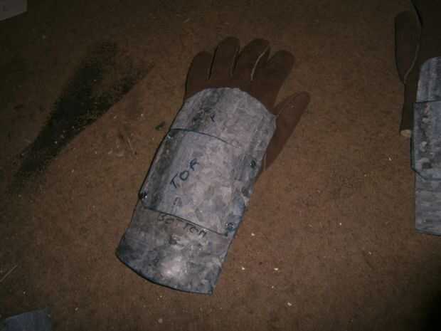 Ahora, utilice el plato principal para determinar donde desea que las uniones conectivas para colocarse. Lo hice a ojo por causa del tiempo. Continuamente Marque y perfore agujeros en la pieza, comprobar y cambiar la forma de la curva para encajar los agujeros si no alinean. Lo mismo debe hacerse con el guante. Elegir los orificios para colocar el guante y marca y taladro (o poke, si usando unas tijeras) una abertura a través.