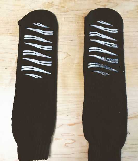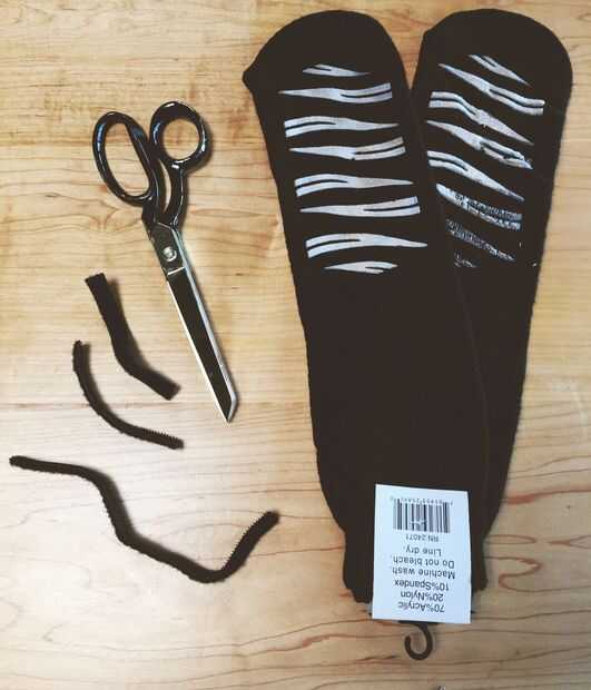 Preparándose para una bola de año nuevo... negro, brillante vestido este año...Accidentalmente, me cruzo con algunos calcetines brillantes viejos, un poco rotos en mi armario, y surge una idea! GUANTES!Paso 1: Cortar la parte superior de su viejo par