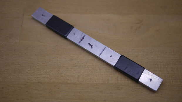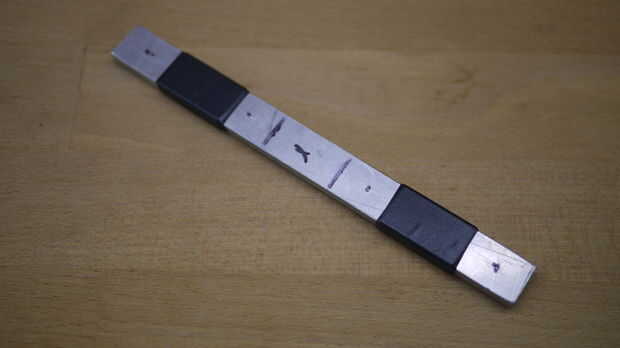 Luego pegadas las dos piezas de acero juntos antes de perforar.