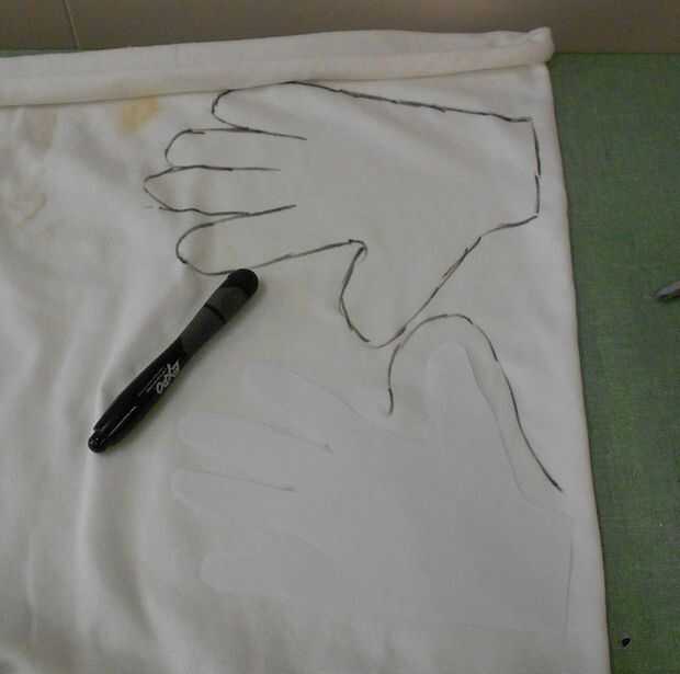 Su patrón, doble su tela original por la mitad y trace una línea alrededor de la mano con un margen de costura de media pulgada. Esto es porque las manos no son planas. Necesita mover de un tirón el patrón para la izquierda y la mano derecha.