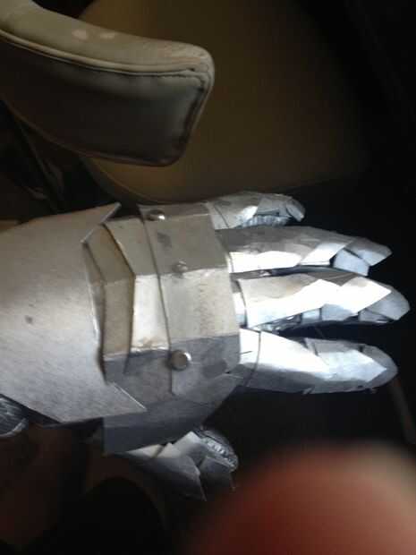 Caliente pegamento las piezas de Junta de cartel en los guantes y rociarlas con pintura de aerosol metálica. Usé la plata para una mirada de acero.