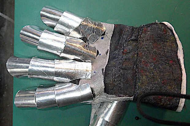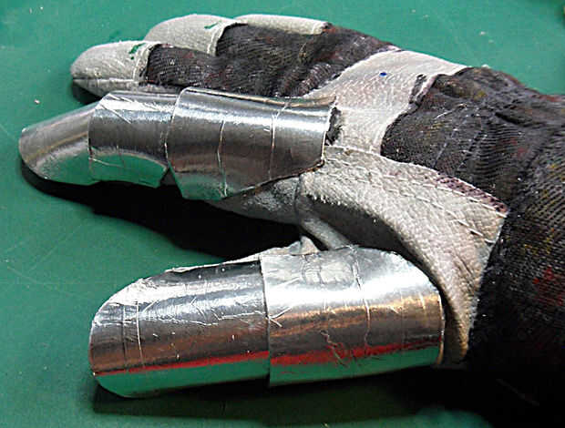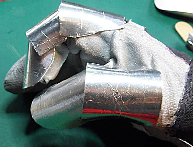 Puede colocar algo en el guante (rotulador grueso y acolchado) y pegar las piezas en uso de nudillo marcas como un gremio, o como yo elegí hacerlo, use el guante al pegar.