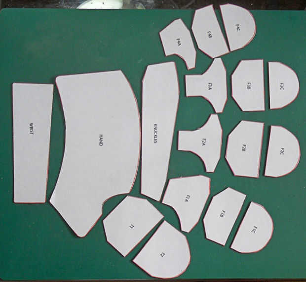 Una vez que todas las piezas se recortan lay el fuera como van en el guante.