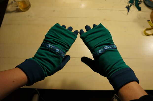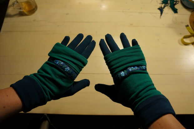 Estos guantes de costura requiere alguna experiencia en costura. Esto es principalmente porque los dedos requieren un poco de precisión. El patrón sí mismo no es difícil: sólo a usar la mano como una base para el guante y crear un cilindro de un rectángulo para la segunda capa. Ambas capas están hechas de tela con algún tramo (como jersey), y pensé que era un toque agradable al utilizar diferentes colores y una cinta que reúne a los dos colores.
