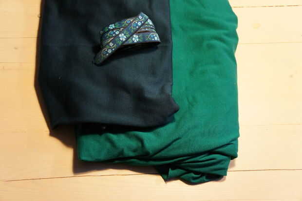 Para este proyecto necesitarás tela elástica, como el jersey, en dos colores. En mi caso fue azul tela #1, #2 la tela verde. Mi tela verde era un poco más delgado y más elástico que el azul, que hace perfecto para la capa superior. Adición de la cinta es opcional, pero es una buena manera de cubrir las puntadas de costura a los dos tejidos juntos.
