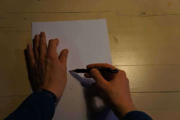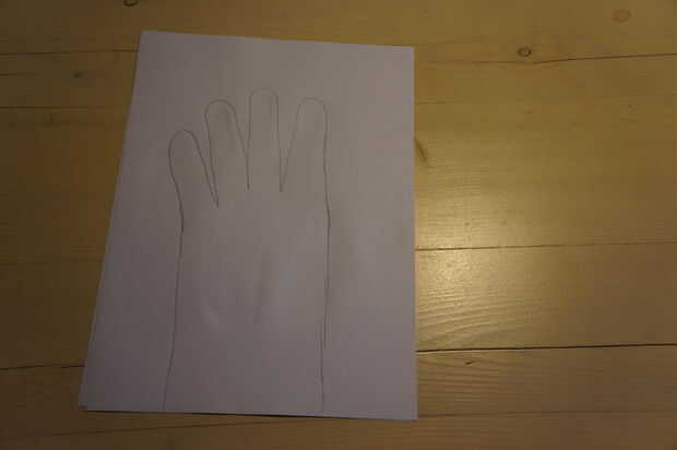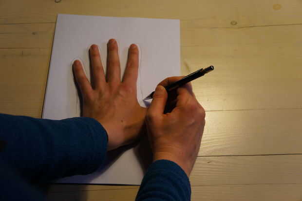 - Dibuja alrededor de su mano en un pedazo de papel. Extendió los dedos hacia fuera un poco, de tal manera que el dedo índice y ese lado de la mano (excepto el pulgar) forman casi una línea recta (ver imagen). Asegúrese de que tiene unos 0,5 cm de ancho adicional para cada dedo. Usted no necesitará agregar longitud extra en la punta de los dedos.