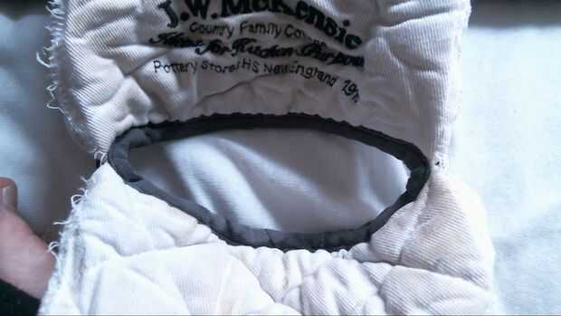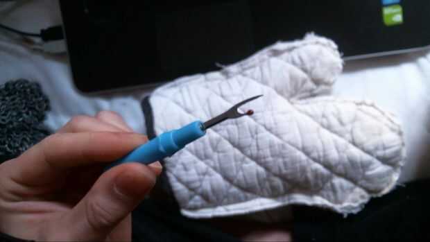 Permite iniciar simple, toma el ovenmitt y tirar adentro hacia fuera. Mientras que su revés puede exponer la costura un poco más fácil, hacerlo y utilizar threadcutters / Tijeras / Cuchillo para desgarrar la costura. Su ovenmitt podría tener un ojete pequeño (uno de esos anillos para colgar en un gancho), puede tirar esto.