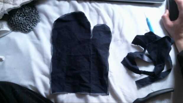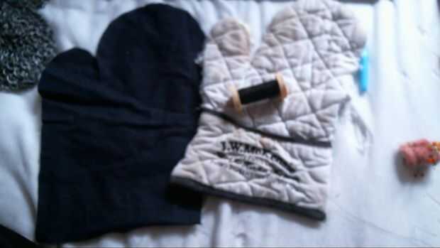 Tomar una de las mitades de la ovenmitt y permite averiguar de qué lado que desee en el interior. En mi ovenmitt hay un logo grande en el exterior y es bastante su bastante dañado y grasa, así que decidí ponerlo dentro.