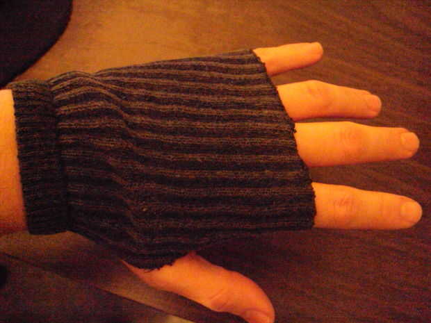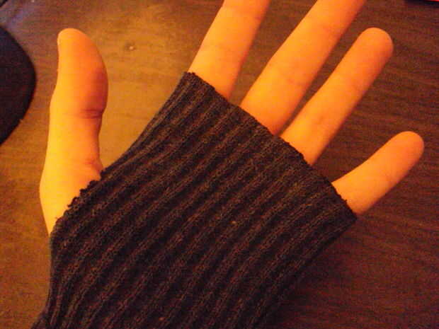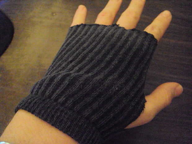 > una vez que han cortado que parte puede lanzar lejos, ahora tienes que cortar los agujeros del pulgar. Lo que hizo fue poner el calcetín en la mano y adivinado donde estaría el orificio.