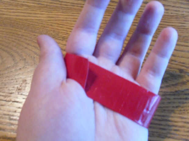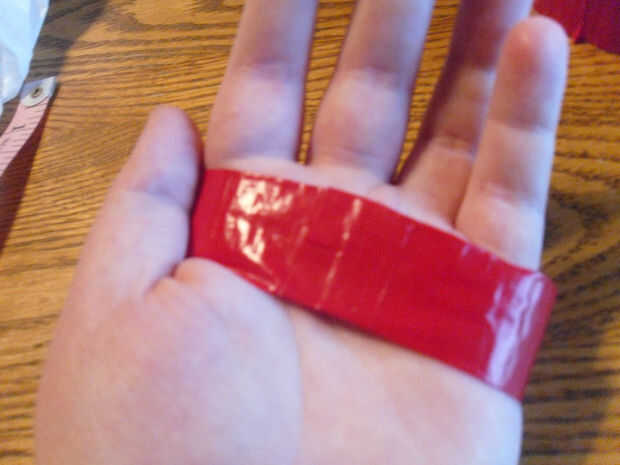 Envuelva la tira que acaba de hacer alrededor de su mano (donde están tus nudillos) y succure con otro pedazo de cinta adhesiva.