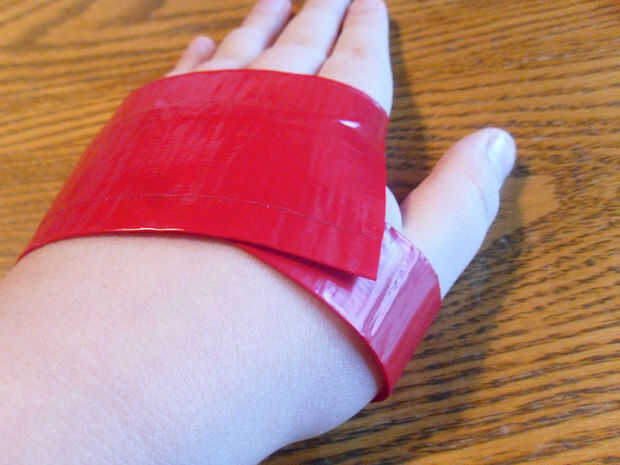 Tomar una tira de cinta adhesiva y pegarla en la tira que acaba de hacer, así que hay un poco sobresaliendo, basta que usted puede pegar en la tira de nudillo, pero no tanto que cuelga de la tira de nudillos. Poner la tira de nudillos de su mano y la tira de palma que, comenzando en la parte posterior de su mano donde está el pulgar y terminando en el mismo lugar en el otro lado de la cinta. Hacer otra tira como la tira de nudillos, apenas más corto, alrededor de 4 pulgadas de largo. Cinta adhesiva un extremo en el interior de la parte inferior del guante, Dónde está el pulgar. Colóquese el guante y el otro extremo en el interior de la misma esquina en el otro lado de la mano de la cinta. Pegar otro trozo de cinta en la parte superior por lo que parece más agradable.