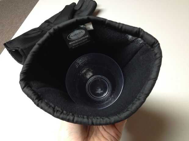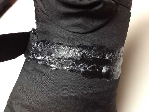 Por lo general, sellado de costura se realiza en el interior de la tela ya que deja un brillo notable, pero ya mis guantes están revestidos de una manera que no podía llegar directamente a la parte posterior de estas puntadas, lo hice en el exterior. Para aplicar el sellador un poco más fácil, usé un vaso de agua en el guante para estirar la parte inferior estrecha. Este sellador 'roll on' estilo tiene un aplicador de espuma similar a un marcador del bingo (pregunte a su abuela). Que básicamente sólo frotis/trapo/dab sobre la costura. El primer guante que traté de limpiar sobre la costura y mis líneas no era demasiado recto. Ya que usted podrá ver en todas partes que se aplica el sellador era un poco más cuidadoso en el segundo guante. He encontrado que una serie de puntos de lenguados dio lugar a una aplicación mejor aspecto - por lo menos al sellar la costura de zig zag. Volví y retocarse el primer guante a mis líneas.