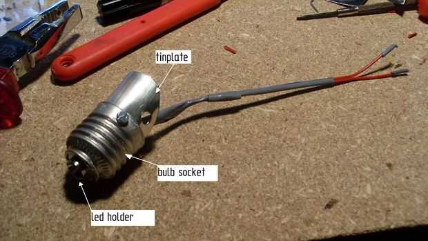 El titular de la LED (paso 3/nr: 13) se mueve desde la parte delantera de la toma de corriente a través de la placa de lata anillo (Paso4). En el interior el soporte se fija con un perno de la tuerca. El LED se empuja desde el interior al titular del LED y la tapa de plástico blanco (Paso8) garantiza una conexión segura entre el titular y el LED.