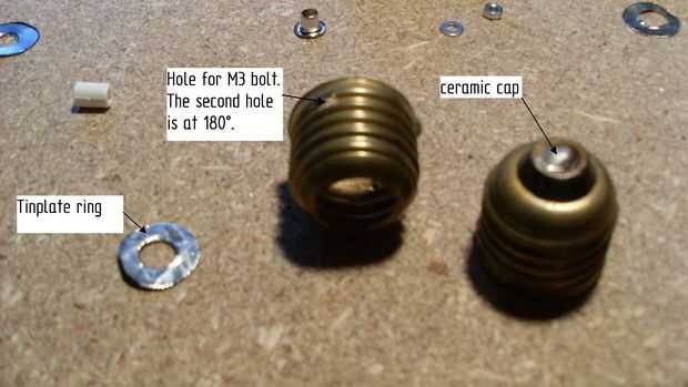 Derecho un alambique tiene una tapa de cerámica. Tomé 10 de ellos, quitar las tapas de cerámica y taladrar dos orificios para tornillos de M3 a los lados.