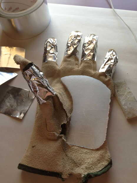 yo no estoy seguro de que lo caro es cinta de aluminio, pero lo tenía tendido alrededor de la casa. Tuve la idea de utilizarlo, no sólo para parchear los agujeros en mis guantes anteriores, pero para un material diferente para el pegamento para montar, y que realmente hace la diferencia. Originalmente pegué mis piezas de tablero de corte directamente a la tela en el guante y no sostuvo bien. El pegamento adhiere mucho mejor con el aluminio y el plástico.