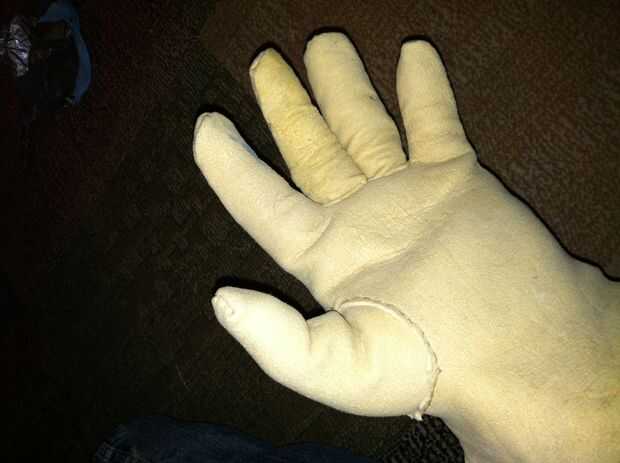 2) si se trabaja con cuero o ante, mantenga una estrecha vigilancia en el espesor del material. Puede ser muy más fino o más grueso en las diferentes áreas. Generalmente para guantes de trabajo desea que la parte gruesa a la palma de la mano.