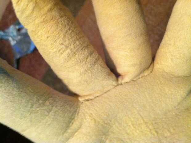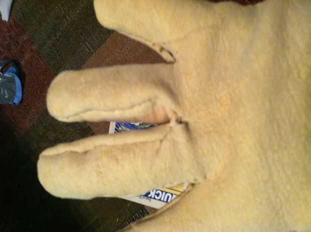 La base del dedo del medio y los dedos del anillo son las partes más difíciles si usted me pregunta. Para ayudar, lo que quieres hacer es coser primero la línea externa del dedo. El que comienza en la base, va a la punta de su dedo y luego de vuelta a la base del otro lado. Hacer eso primero y hacerlo por separado. Cuando hice mi guante derecho he intentado continuar la costura terminada un dedo en el dedo siguiente. A la derecha ¿por qué no? Bien terminó haciendo demasiado apretado alrededor de mi dedo el anillo de la base del dedo.