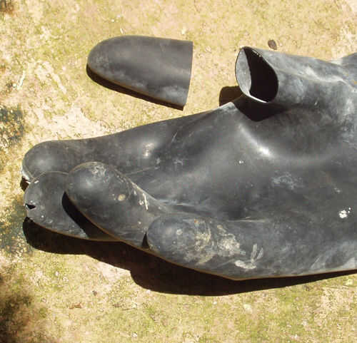 Unos guantes son más allá de la reparación, pero todavía buena para donar material de parche. Parches planos se pueden cortar desde la zona del manguito. Parches de punta de dedo se pueden cortar el pulgar o los dedos más grandes que el diámetro del dedo a ser parcheado.