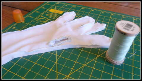 Vuelva el guante. No vuelva la pieza del pulgar. Introduzca el pulgar en el guante y han llegado los extremos sin cosido a través del orificio. Gire la pieza del pulgar hasta el dedo pulgar es colocado correctamente (apuntando hacia arriba como los otros dedos). Me gusta el pedazo de pulgar en el orificio del perno y coser 1/4 del borde otra vez. Coser esta parte con la mano así que no tengo que intentar meterse en mi máquina de coser. Esto es una elección personal.