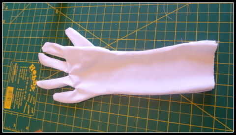 Usted podría dejar los guantes como son en este paso. Una buena calidad de punto a tela (stetchy) no se fray, para terminar los extremos es su opción. Para los guantes que he hecho, yo uso recorte sobrante del vestido que para embellecer.