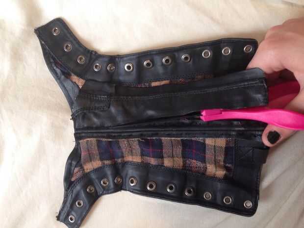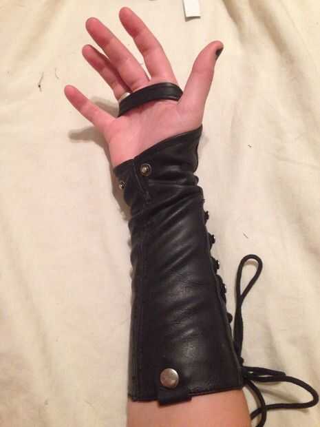 Ahora que tienes tu guante todo cosido recortar el exceso de material dentro del guante. Ahora sólo estamos falta la correa del dedo que ayudará a mantener el guante en el lugar. La colocación exacta de esta correa es suya. Basado en cómo mi guante encajan como bien como quería limitar la movilidad del guante en mi mano que elegí para ir alrededor de mi dedo índice y anillo. Hice la correa fuera el exceso de material sólo había recortado en el guante, simplemente cortar y doblar sobre cada lado a coser en una correa simple (ver tercera imagen). Luego he comprobado la colocación de las correas en mi mano para ajustar la tirantez (tenía que tener el guante para esto), cubrió la correa y mano cosen al guante (ver cuarta imagen).
