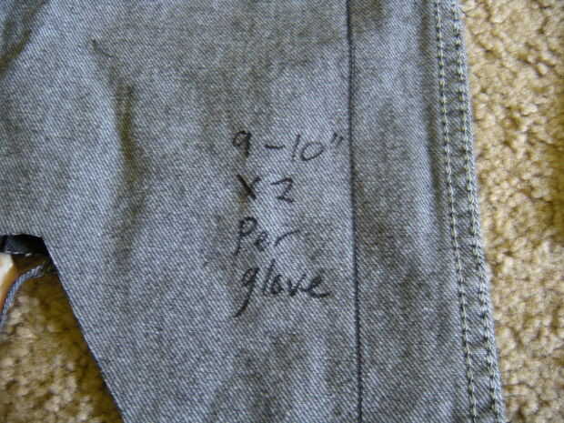 Para la parte inferior de los guantes, cortar 2 tiras de tela cada 9-10 pulgadas de largo. Hacer esto otra vez para el otro guante.