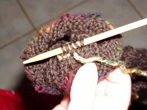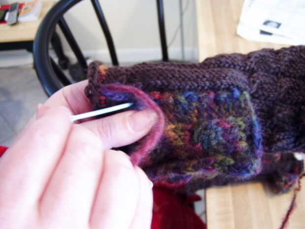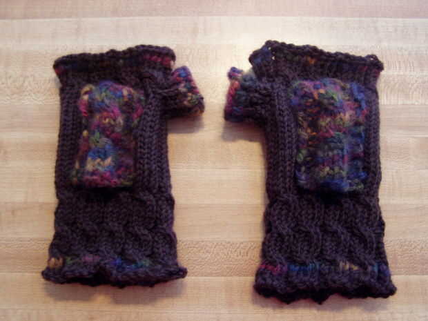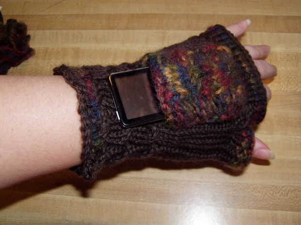 he hecho unos cuantos pares de guantes sin dedos del patrón original en knitty.com (http://www.knitty.com/issuesummer06/PATTfetching.html), hacer modificaciones cada vez. Esta última versión tiene un bolsillo que se adapta un iPod Nano bastante bien (o una licencia, tarjeta de crédito, etc.), acanalado arriba (en lugar del puntilla lazo apagado), ligeramente más largo pulgar borde w de la costilla (para evitar rodar hacia abajo) y algunos acentos de color. Liga puntada en lugar de las dos costillas donde los bolsillos deben colocarse para hacer el bolsillo más profundo. El cuerpo principal del guante está en b y c de los Patons clásica lana Merino que me encanta lana para objetos calientes y regalos que quiero ser capaz de ajustar el tamaño del más adelante por la contracción o estiramiento si no encajan bien y para lo acentos y los bolsillos leones Jiffy Mohair ver hilado b y c me gusto los colores y sabía que no extienden (no las perdidas iPod!). Dio como un 40 cumpleaños presente con una bufanda que fuera el hilo de leones - la bufanda era un gran cable (2 hilos ligadas tamaño 17 agujas, co 14 y cable delantero 7 puntadas cada 15 filas) para que pueda meter el extremo a través del "agujero" en el cable crossover y mantener fácilmente la bufanda. Estoy feliz de proporcionar un patrón completo para tanto/tanto si esto es solicitado en un comentario Posteado. Kntting feliz!