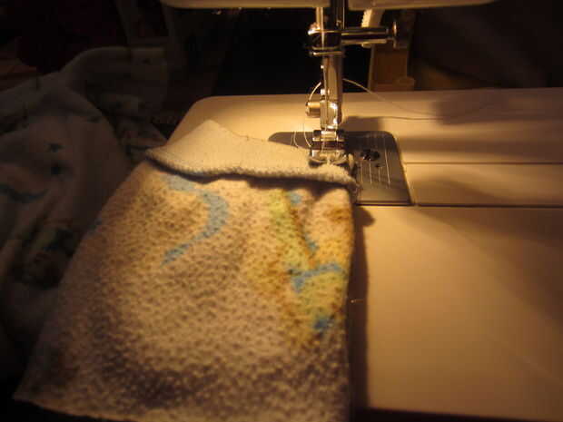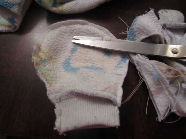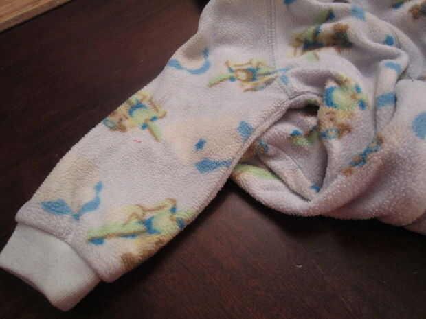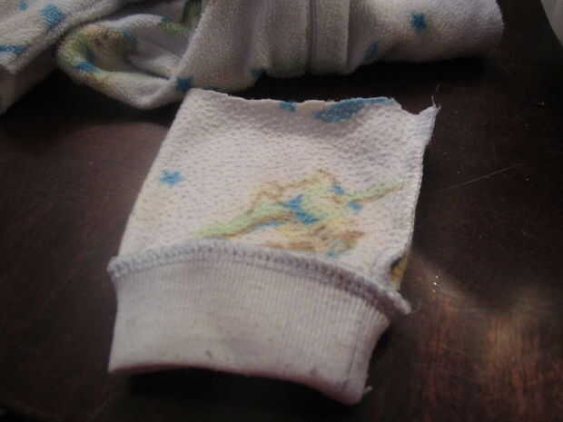 Comencé excavando a través de la bolsa de la ropa que fue tan ridículamente manchado y desgastado que el propósito razonable sólo para que pude pensar en usarlos fue coser tela pañal insertos. Encontré un durmiente de paño grueso y suave del tamaño de 12mo, pero cualquier camiseta de tamaño, cama o pantalones con un brazalete en deben trabajar.