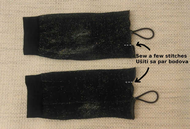Con hilo y aguja, hacer unas puntadas para el pulgar. Luego, coser en un lazo de goma para tirar su índice o el dedo del medio a través de él.
