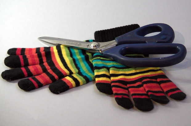 En primer lugar, cómprate un par barato de guantes. Me parece que los levemente elásticos funcionan mejor, como los dedos todavía quepan cómodamente después de que recortarlo.