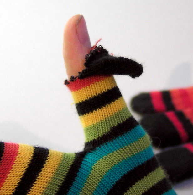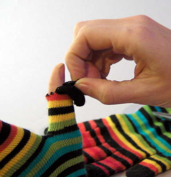 Ahora, continuar el corte en el dedo elegido. Si usted quiere ir abatible, corte una muesca justo lo suficientemente grande como para pop su dedo hacia fuera, decir 1/3-1/2 camino alrededor de la yema del dedo. Si desea cortar todo, puede sólo muesca (o la línea, tenga en cuenta si tienes guantes de rayas), retire el guante y corte una línea incluso.