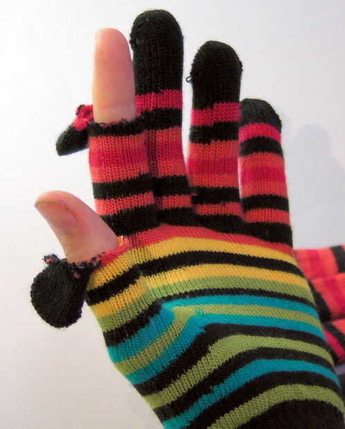 una amiga envió un par de medias de la rodilla y me preguntó uso a hacer un par de guantes sin dedos. La imagen que envió de su visión mostró un pulgar pedazo (a diferencia de un agujero del pulgar), así que me senté a averiguar cómo hacer para crear