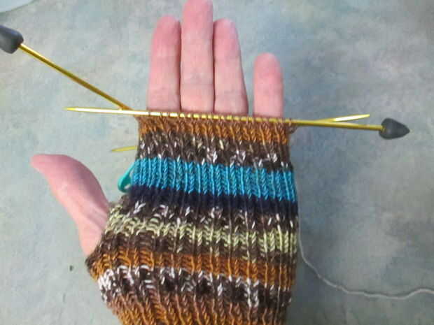 una amiga envió un par de medias de la rodilla y me preguntó uso a hacer un par de guantes sin dedos. La imagen que envió de su visión mostró un pulgar pedazo (a diferencia de un agujero del pulgar), así que me senté a averiguar cómo hacer para crear