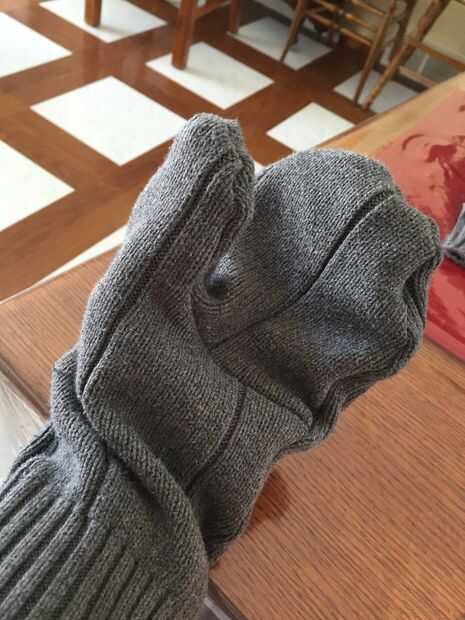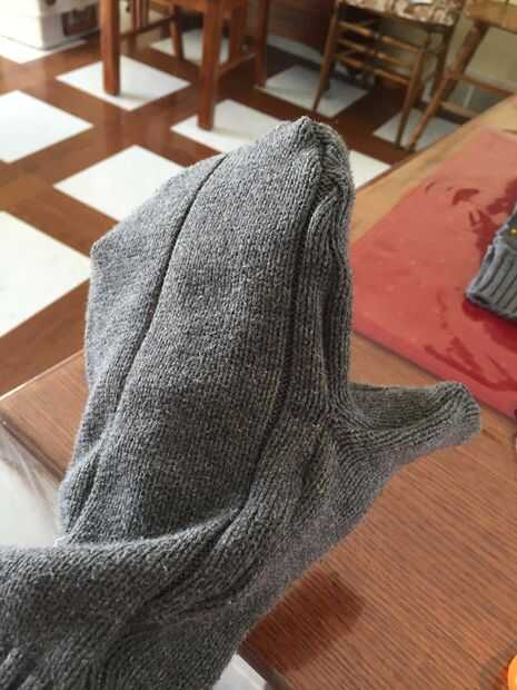 Yo jugaba con la costura y comenzó las costuras con el borde exterior subiendo. Puesto que ya están conectados los manguitos es mitad del trabajo hecho por ti! Había cosido a la mitad para arriba y luego dejé y coser la costura en la palma. Esto tenía sentido para mí porque he encontrado que parte de la costura de la costura lateral y, a continuación, la costura de Palma añade estabilidad a la manopla general y facilita acabado el pulgar del borde del guante. Ir alrededor de las costuras y recortar las esquinas y cualquier bit que es descuidado. Girar la manopla derecha en preparación para el bloqueo y acabado. En este punto, probar la manopla en quien va a usar y ajustar en consecuencia el brazal. Tuve que tomar un poco.