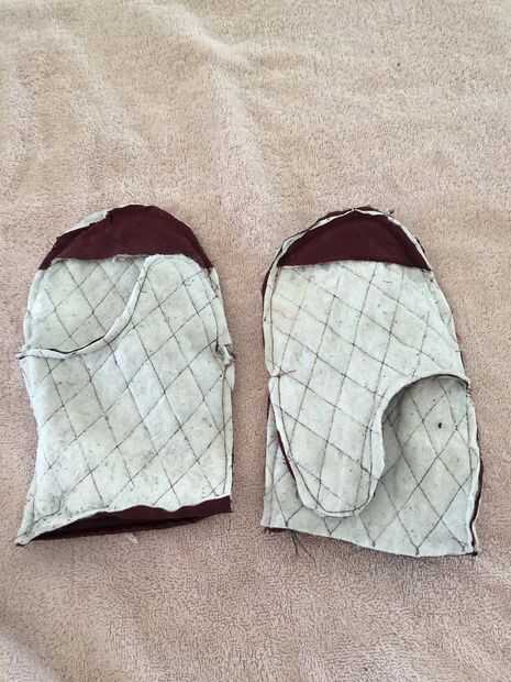 Hacer frente a la guarnición de la misma manera. Recuerde que no hay ningún manguito y que las piezas son independientes. El revestimiento que usé era resbaladizo dentro así que tuve que cuidar que las costuras me alojé mientras cosí. Lo hice en el mismo orden, fuera de la costura superior medio luego costura entonces fuera el borde del pulgar de la palma. Segundo, tomar las tapas para reforzar las puntas de la guarnición (top derecha 4 fotos) y en el forro cosido. Emparejar los bordes y coser alrededor del borde superior del revestimiento solamente. Las capas extras no girarán una vez la guarnición en la manopla para que los no virar hacia abajo. Coser alrededor del borde superior debería ser suficiente para asegurarlos. Por último, doblar la parte inferior trasera del revestimiento y coser lados mal en un dobladillo pequeño. Se trata de terminar para el bolsillo de las HotHands entre el revestimiento y los guantes después de terminar. Consulte la fila superior, 2 º foto de la derecha.